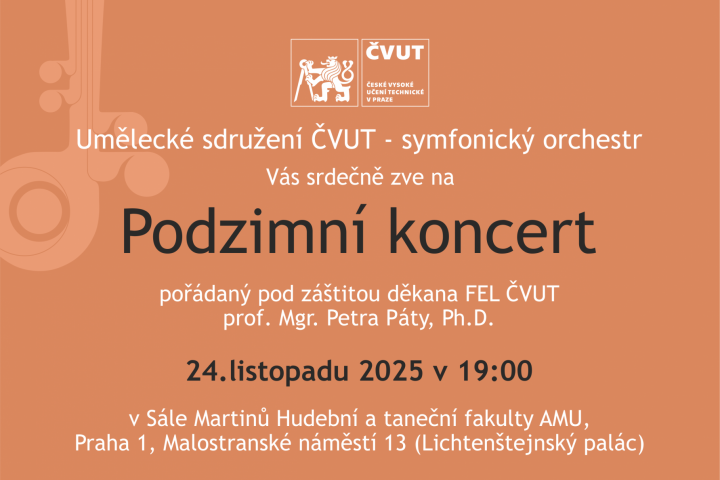 Umělecké sdružení ČVUT - symfonický orchestr zve na Podzimní koncert, který se koná v pondělí 24. 11. 2025 v 19 hodin v sále Martinů Lichtenštejnského paláce Hudební a taneční fakulty AMU v Praze 1, Malostranské náměstí 13.