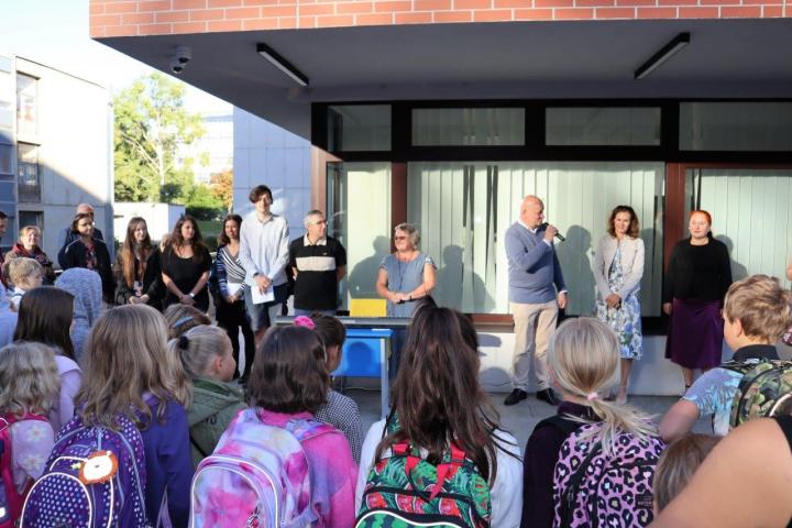 Na zahájení školního roku v základní škole, jejímž zřizovatelem je ČVUT v Praze, se přišli podívat také rektor Vojtěch Petráček a kancléřka Lucie Orgoníková.