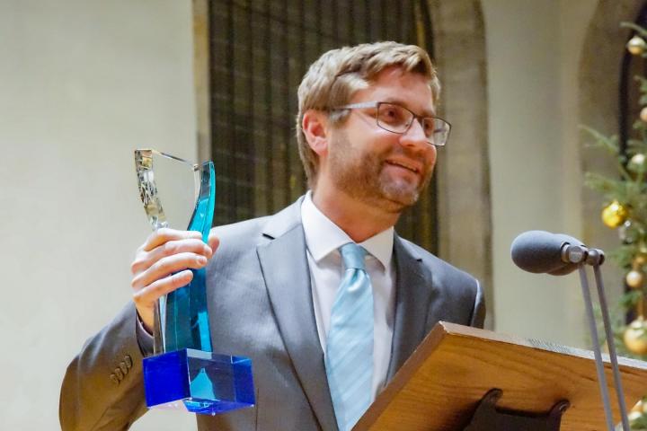 Dr. Jan Rataj si cenu převzal od zástupců Inženýrské akademie a jejího předsedy - a zároveň rektora ČVUT doc. RNDr. Vojtěcha Petráčka, CSc. Slavnostní ceremonie se konala 20. listopadu 2023 v Betlémské kapli v centru Prahy.